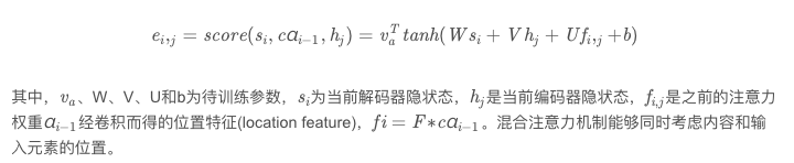 - 对于注意力,Tacotron2使用的是位置敏感注意力(我看了它引用的那篇注意力得到论文,但是我觉得更像是结合内容与位置的混合注意力机制,并不是单纯的位置注意力)下图为解释:(来自于一个博客,懒得自己码公式了)