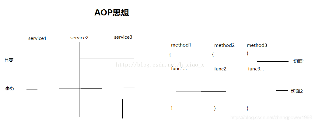AOP就是使用上图所示的“横切”技术,AOP把软件系统分为两个部分:核心关注点和横切关注点。业务处理的主要流程是核心关注点,与之关系不大的部分是横切关注点。横切关注点的一个特点是,经常发生在核心关注点的多处,而各处都基本相似。比如权限认证、日志、事务处理。Aop 的作用在于分离系统中的各种关注点,将核心关注点和横切关注点分离开来。正如Avanade公司的高级方案构架师Adam Magee所说,AOP的核心思想就是“将应用程序中的业务逻辑同对其提供支持的通用服务进行分离”。