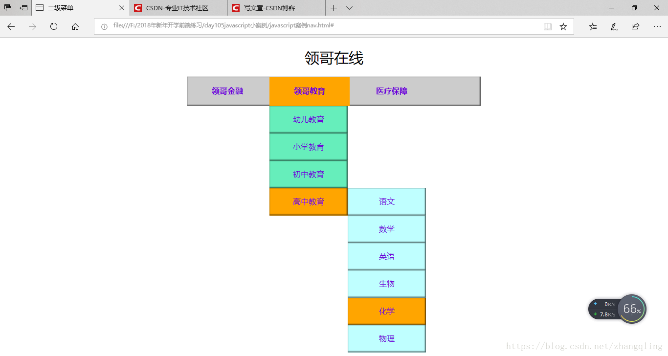 当鼠标放在高中菜单下的化学上时效果。