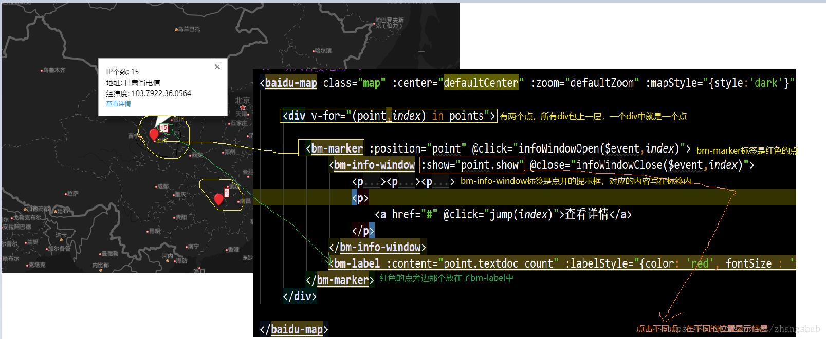 本文档介绍了如何在Vue项目中使用vue-baidu-map插件集成百度地图,并展示了如何设置默认中心点、调整缩放级别以及切换地图主题。通过监听地图上的点击事件,实现在点击坐标点时弹出窗口,点击详情则通过Vue路由进行页面间的参数传递,实现从地图详情到其他模块的跳转。