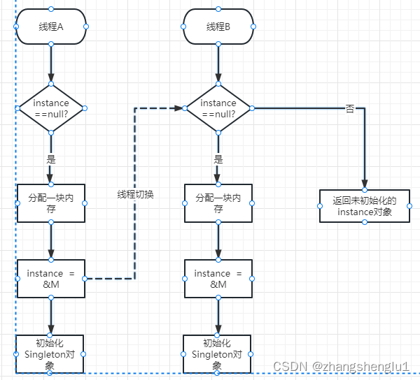 如果按照正常顺序来说也不会有问题,但是指令2和指令3之间不存在依赖关系,编译器优化后可能产生重排,执行顺序为1 --> 3 --> 2,那么这个时候可能会产生在A线程刚把instance指向对应地址后,B线程获取到执行权,然后获取到一个没有初始化的对象,从而产生空指针异常。A、B两个线程的执行顺序如下: