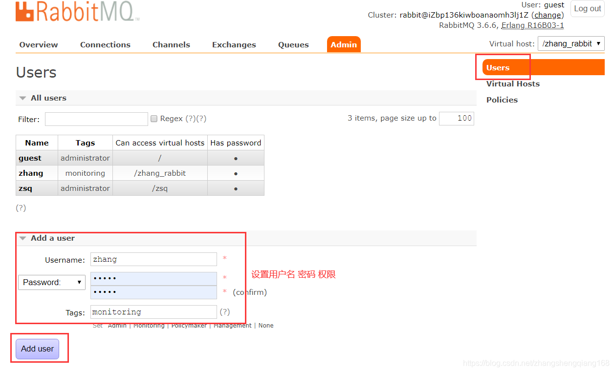 1.使用guest登录 rabbitmq后台 端口15672 账号guest 密码guest