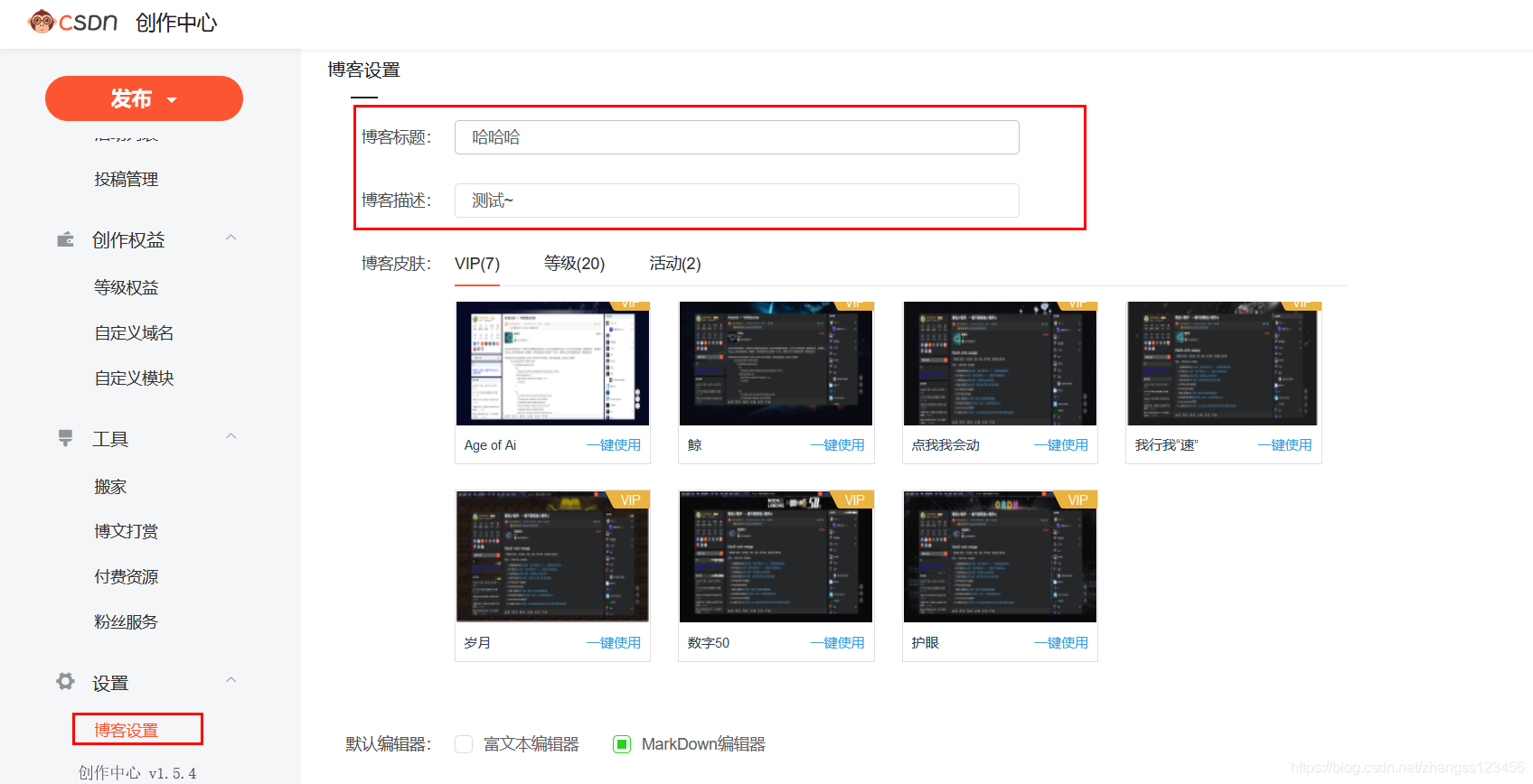 点击网站页面右上角创作——博客设置进行修改进行修改博客标