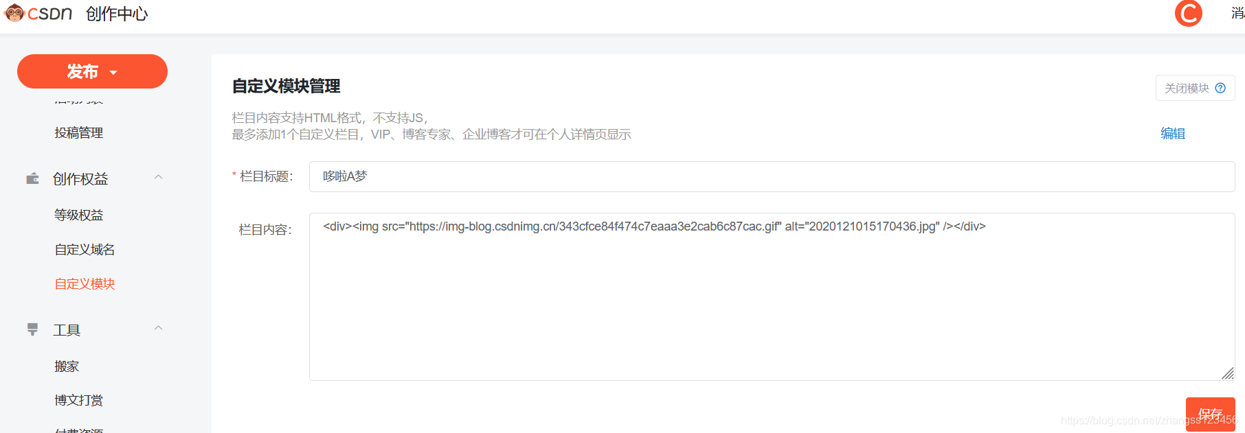 第二步:您打开自定义模块后把代码加图片链接的代码放入即可,效果如图;