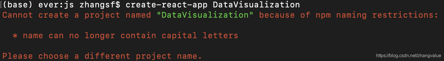 在React出现Cannot create a project named "DataVisualization" because of npm naming restrictions: