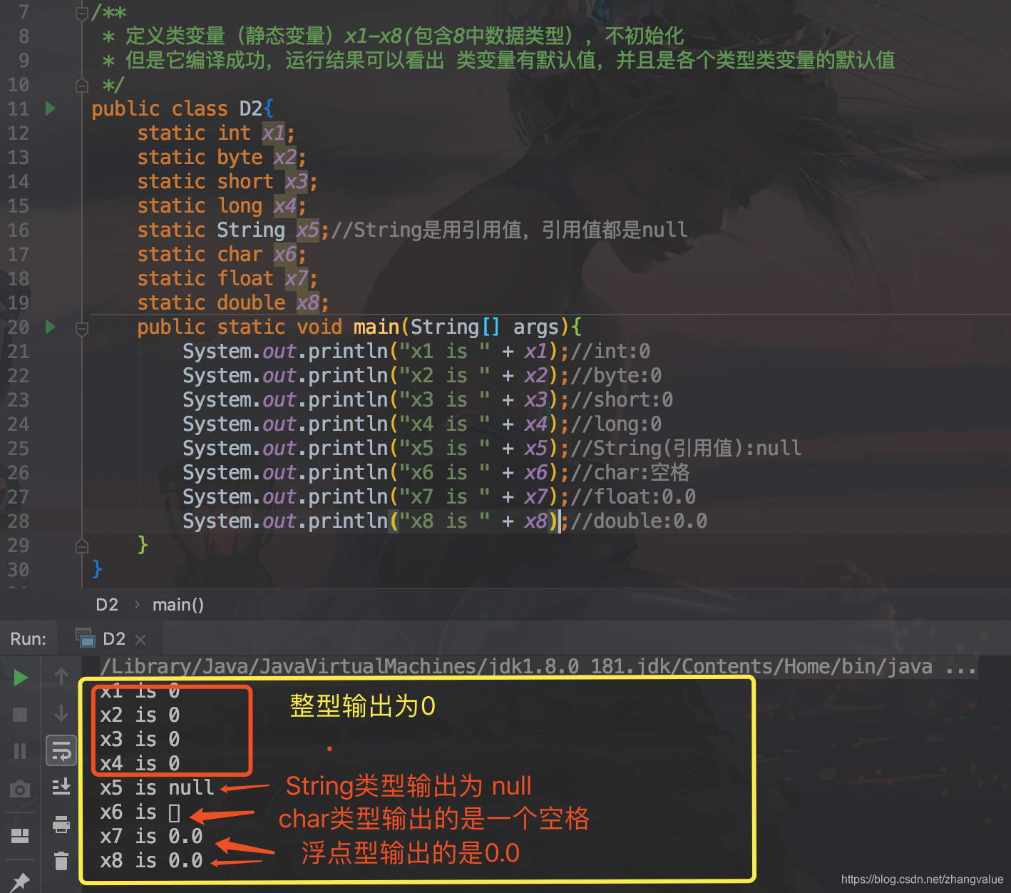 定义类变量(静态变量)x1-x8(包含Java中的8种基本数据类型)