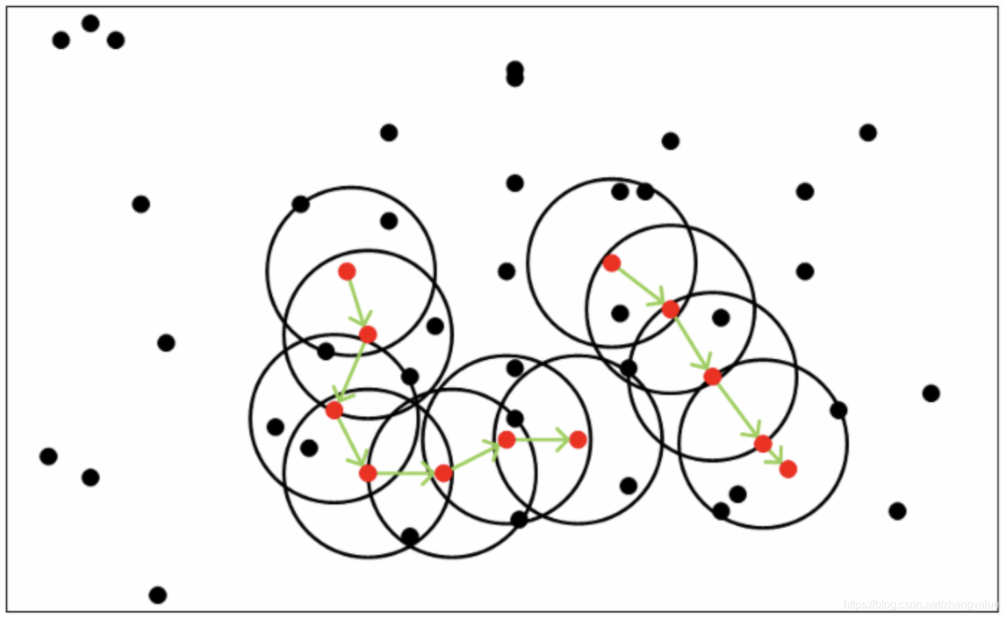 从下图可以很容易看出理解上述定义,图中MinPts=5,红色的点都是核心对象,因为其𝜖ϵ-邻域至少有5个样本。黑色的样本是非核心对象。所有核心对象密度直达的样本在以红色核心对象为中心的超球体内,如果不在超球体内,则不能密度直达。图中用绿色箭头连起来的核心对象组成了密度可达的样本序列。在这些密度可达的样本序列的𝜖ϵ-邻域内所有的样本相互都是密度相连的。