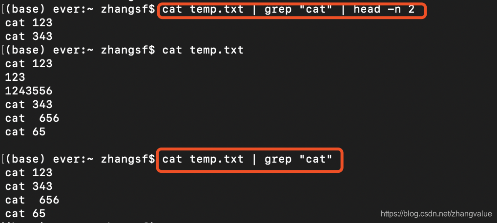 查询出temp.txt中包含关键字 cat 的前 2行 ,去掉后面的 | head -n 2就是查找出其中的包含关键字 "cat"的情况