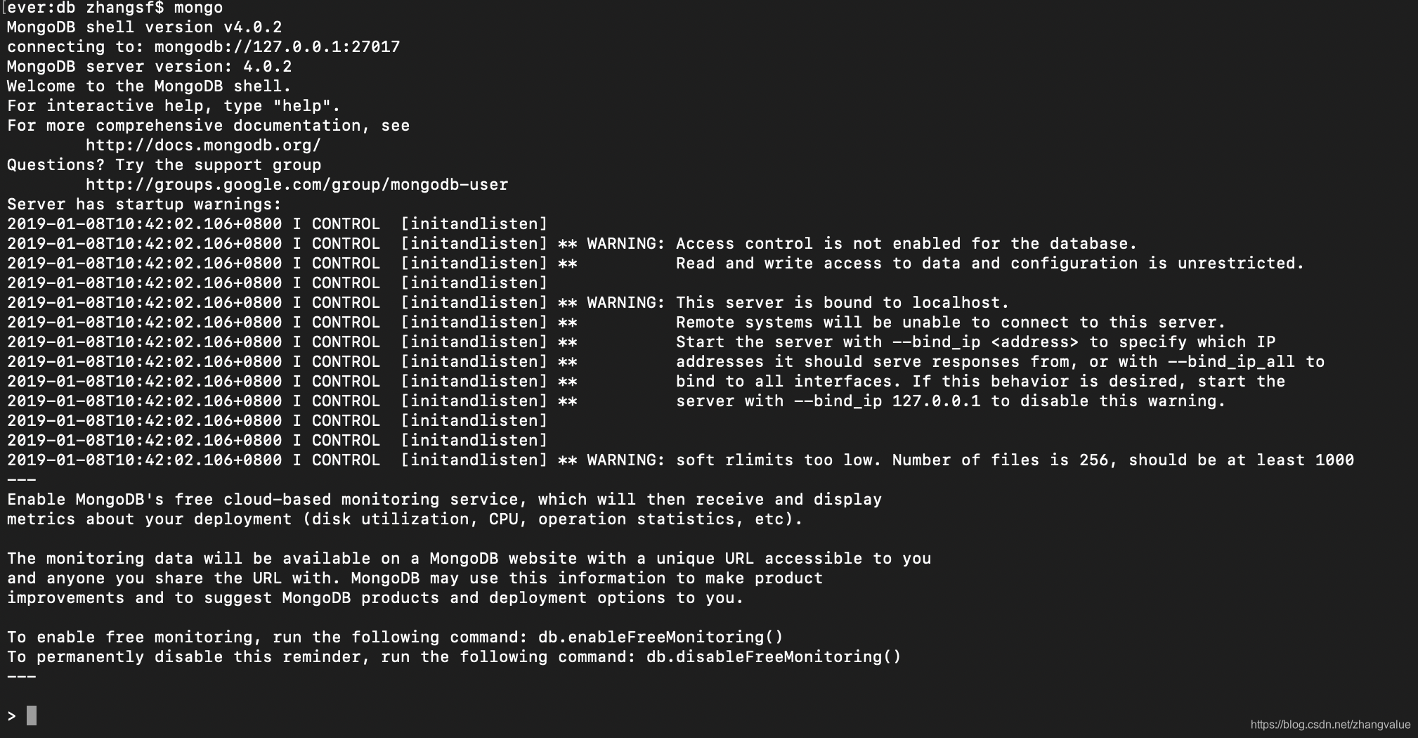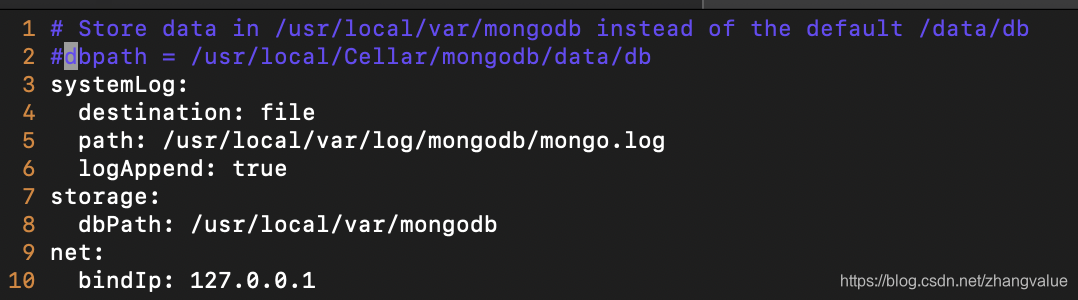 修改mongodb配置文件,配置文件默认在 /usr/local/etc 下的 mongod.conf