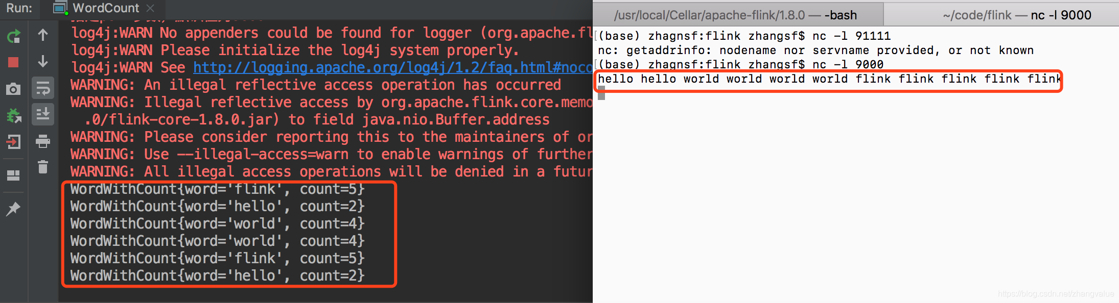 输入hello hello world world world world flink flink flink flink flink,回车。在IDEA的控制台会显示如下单词和词频的信息