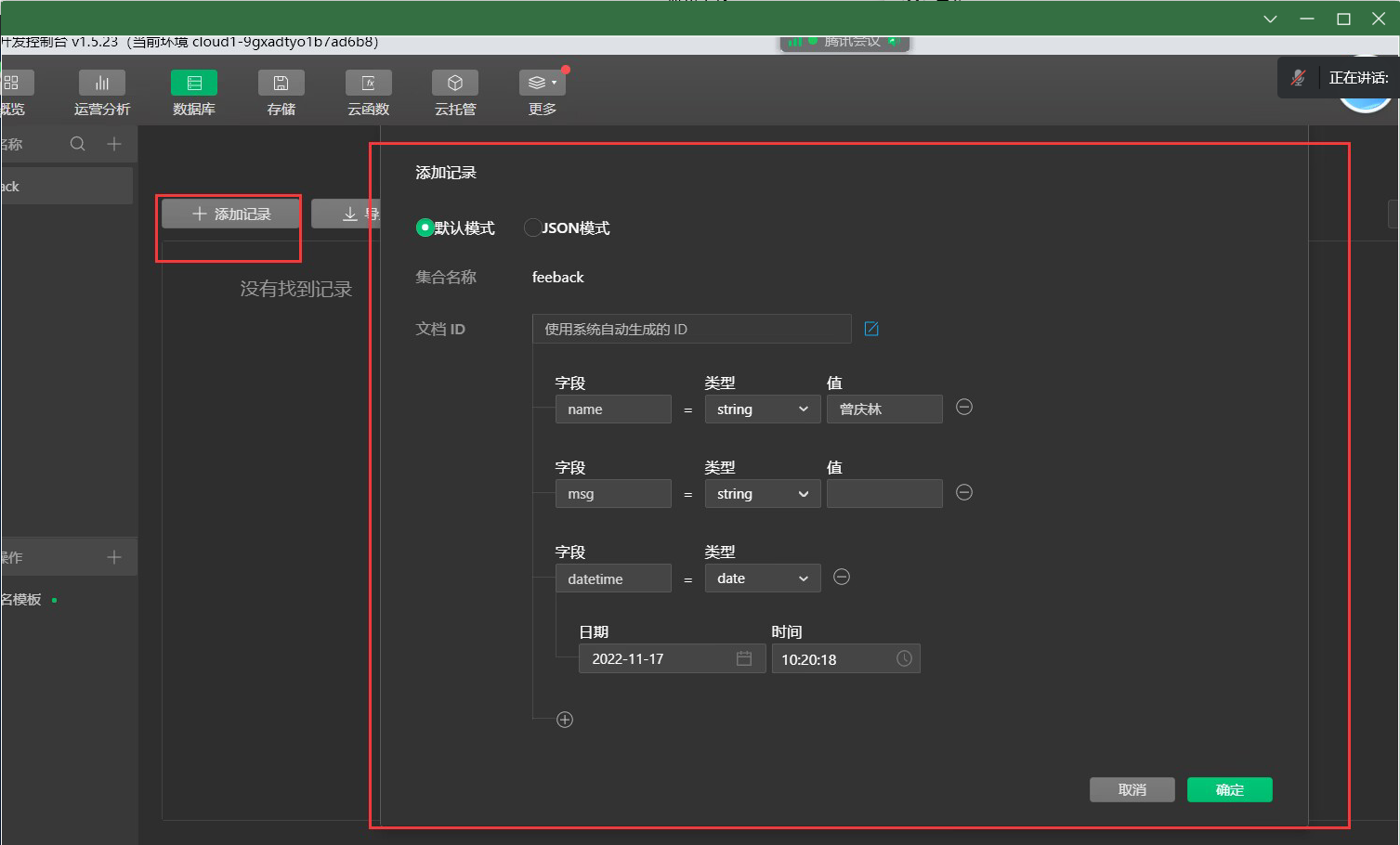 选中要添加数据的数据库,在右侧添加记录,根据所需数据,输入字段、类型、值等信息。