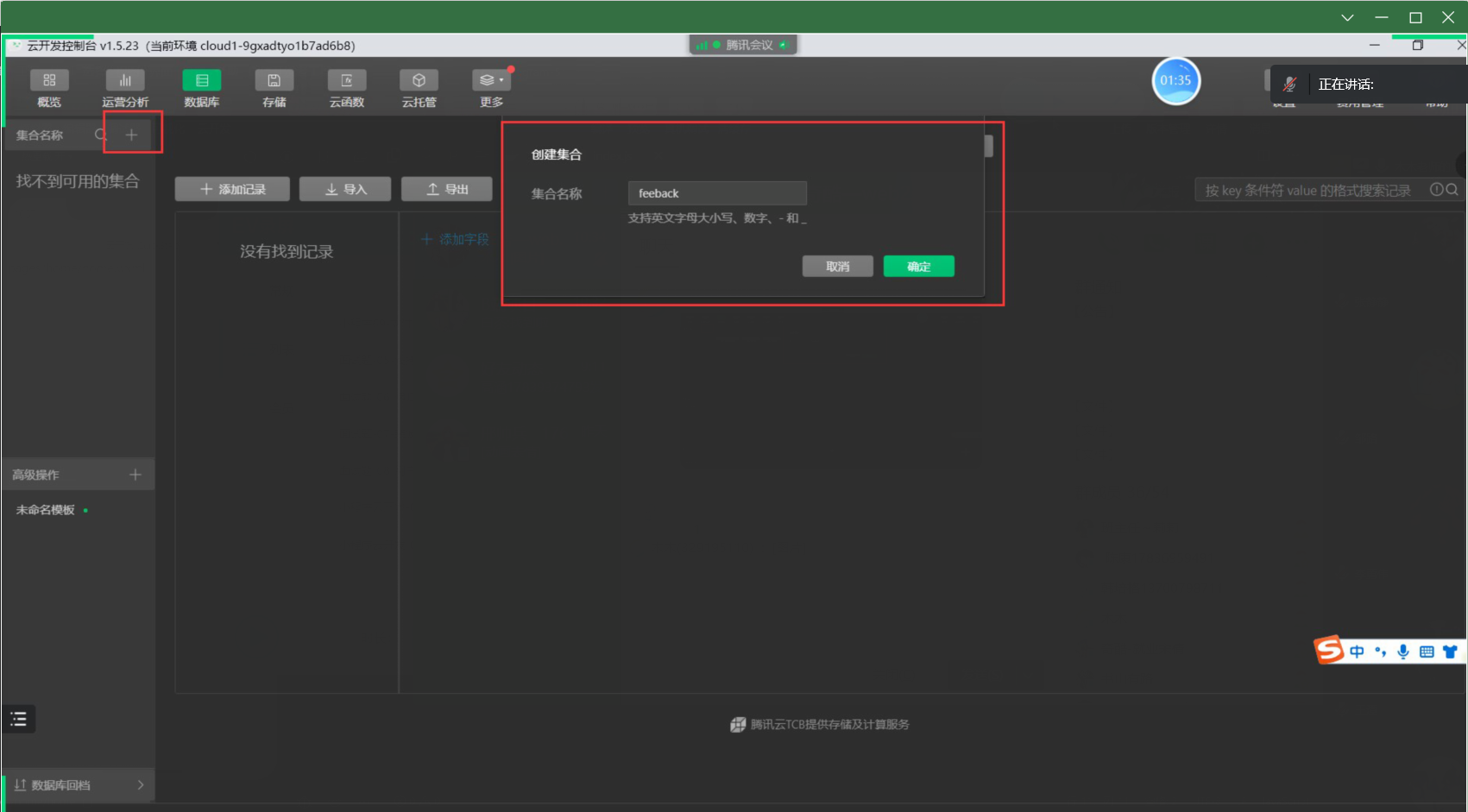 在云开发控制台,选择数据库->新建集合->输入名称->确定,即完成一个数据库的创建。
