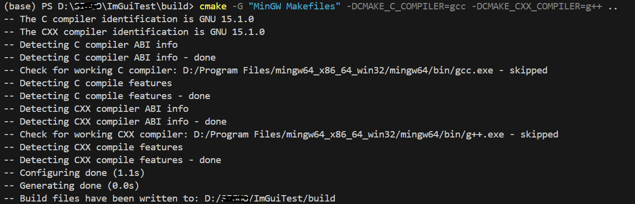 cmake -G "MinGW Makefiles" -DCMAKE_C_COMPILER=gcc -DCMAKE_CXX_COMPILER=g++ ..