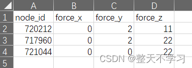 按如下格式准备好需要导入的节点编号和集中载荷数据。第一列为节点编号,第二列至第四列为节点力的三个方向大小。