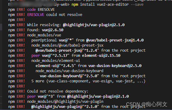 我在安装vue2-ace-editor 时报错,可能是其他依赖包的冲突出现以上错误