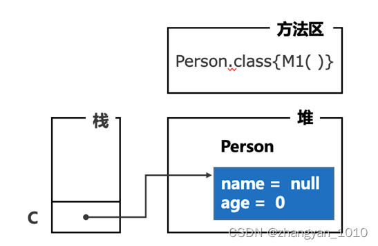 通过图示可以看出,在方法区中,包含Person类的字节码文件,及类的基本信息及方法M1等。