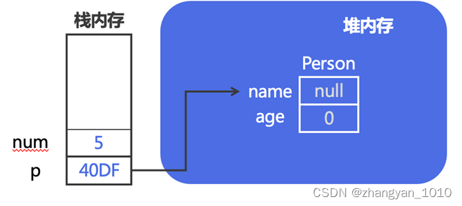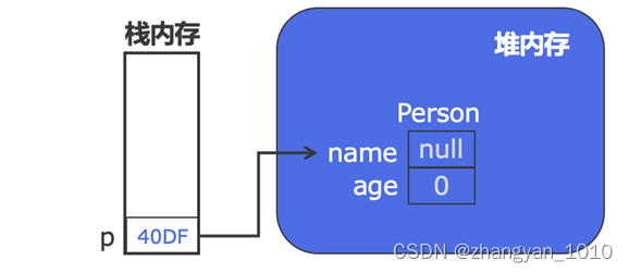从上图中可以看到右侧的堆内存,new Person()所创建的对象在堆中分配,同时成员变量亦在此分配,并赋初始值为零。引用类型变量p在栈内存中分配,其中保存的数据,为对象在堆内存中的地址信息,假设对象在堆内存的地址为40DF,则p中保存的即是40DF。