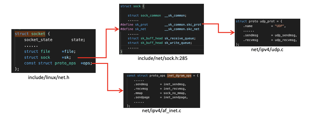 socket数据结构中的另一个数据结构struct sock *sk是一个非常大,非常重要的子结构体。其中的sk_prot又定义了二级处理函数。对于UPD协议来说,会被设置成UPD协议实现的方法集udp_prot。