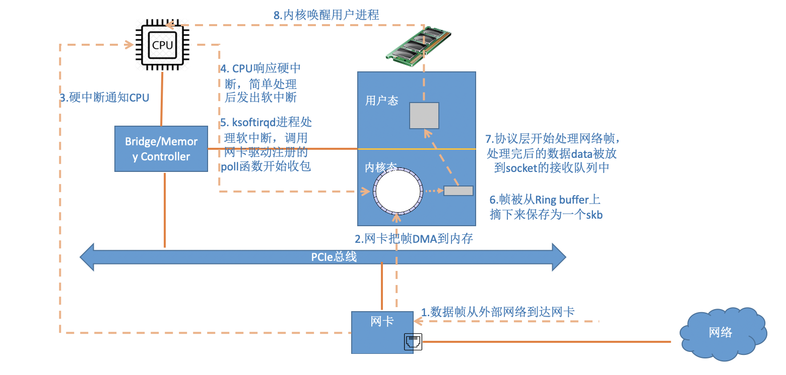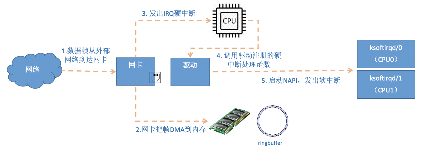 - 网卡将数据帧DMA到内存的RingBuffer中,然后向CPU发起中断通知