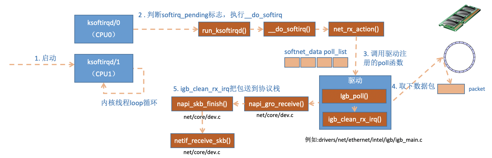 - ksoftirqd线程开始调用驱动的poll函数收包