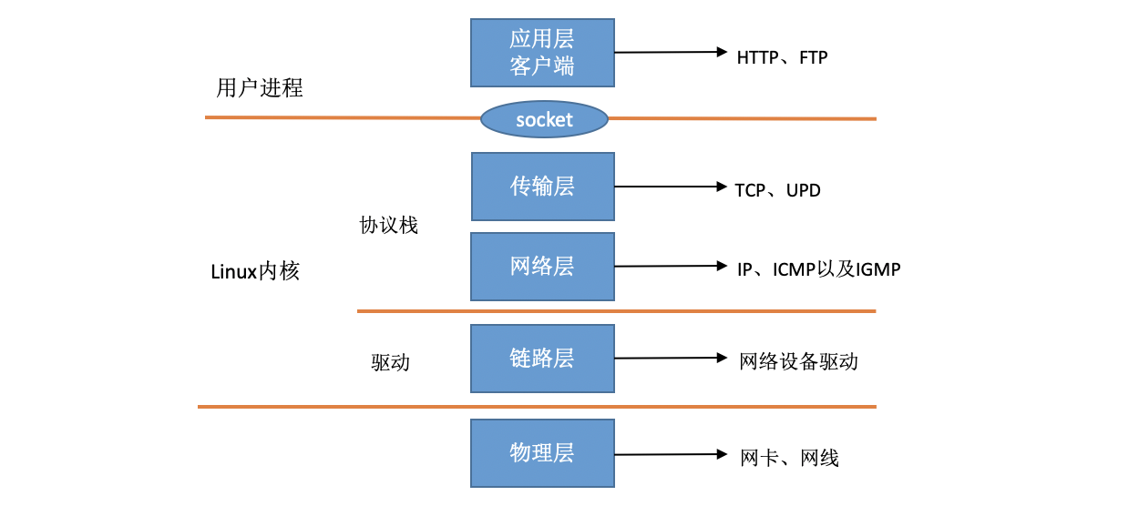在Linux内核实现中,链路层协议靠网卡驱动来实现,内核协议栈来实现网络层和传输层。内核对更上层的应用层提供socket接口来供用户进程访问。我们用Linux的视角来看到的TCP/IP网络分层模型应该是下面这个样子的。