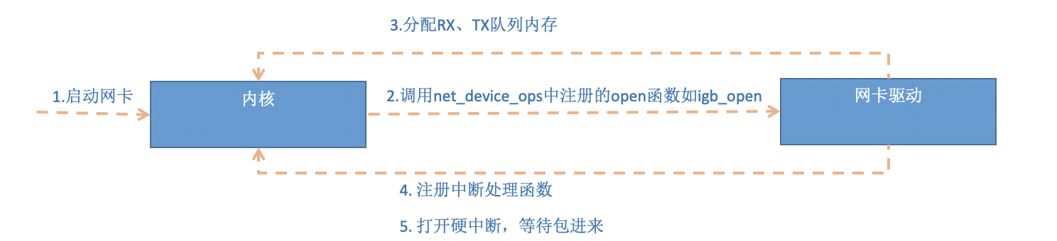 - 网卡驱动初始化,每个驱动都有一个初始化函数,内核会让驱动也初始化一下。在这个初始化过程中,把自己的DMA准备好,把NAPI的poll函数地址告诉内核