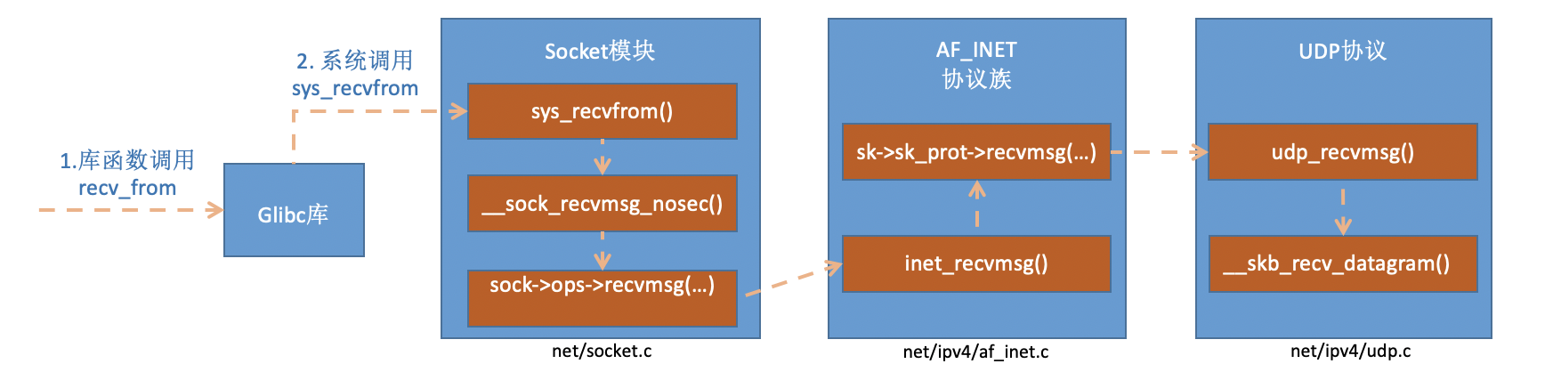 上面代码是非常简单的一段upd server接收收据的逻辑。 当在开发视角看的时候,只要客户端有对应的数据发送过来,服务器端执行recv_from后就能收到它,并把它打印出来。我们现在想知道的是,当网络包达到网卡,直到我们的recvfrom收到数据,这中间,究竟都发生过什么?