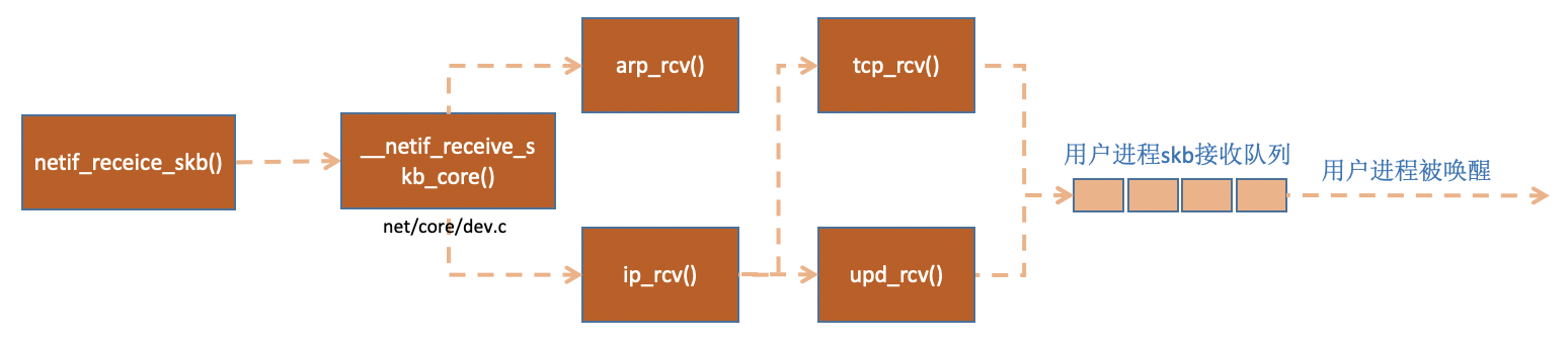 如协议注册小节看到inet_protos中保存着tcp_rcv()和udp_rcv()的函数地址。这里将会根据包中的协议类型选择进行分发,在这里skb包将会进一步被派送到更上层的协议中,udp和tcp。