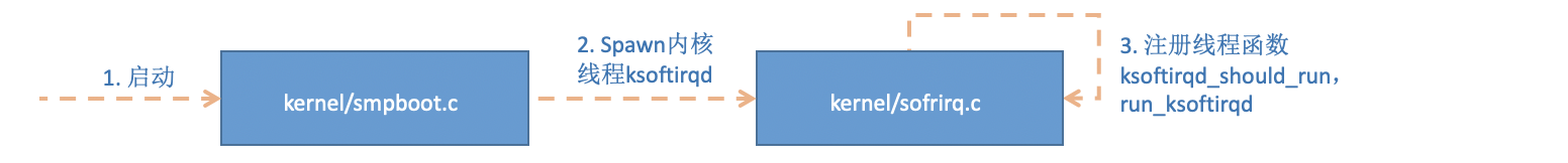 系统初始化的时候在kernel/smpboot.c中调用了smpboot_register_percpu_thread, 该函数进一步会执行到spawn_ksoftirqd(位于kernel/softirq.c)来创建出softirqd进程。