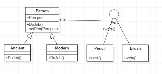 public class Person { public Pen pen; public void setPen(Pen pen) { this.pen = pen; } public void doJob(){ pen.write(); } }