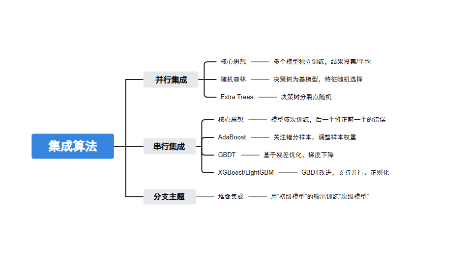 当我们用单个模型(比如决策树、逻辑回归)做预测时,很容易出现 “过拟合”(比如决策树长得太复杂,只适应训练数据)或 “欠拟合”(比如模型太简单,抓不住数据规律)。而集成算法的思路很简单 ——“三个臭皮匠顶个诸葛亮”:通过组合多个 “弱模型”(预测效果一般的模型),形成一个 “强模型”(预测更准确、更稳定的模型)。今天我们就从最经典的集成算法(Bagging、Boosting、Stacking)入手,用代码实现并可视化结果,帮你彻底搞懂它的工作逻辑。