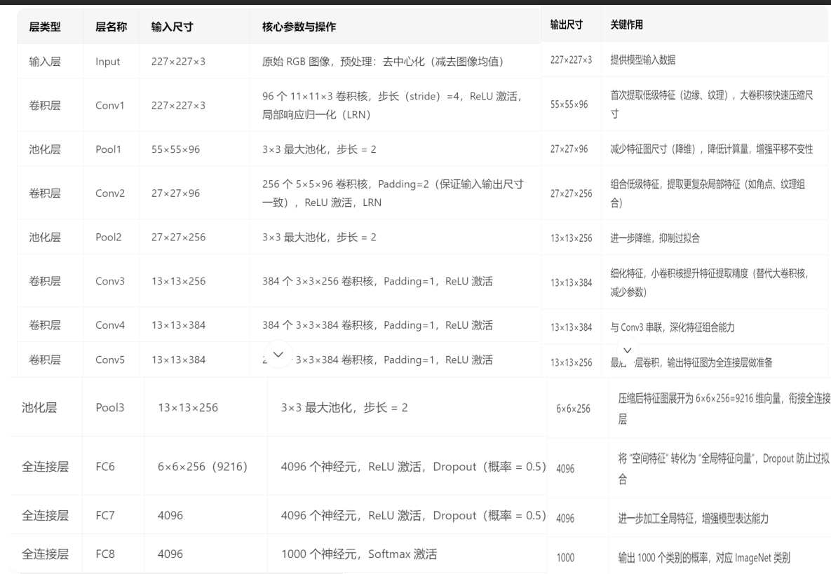 AlexNet 包含5 个卷积层(Conv)+3 个全连接层(FC),输入图像尺寸为 227×227×3(注:论文中写 224×224,实际计算时因卷积步长等原因等效为 227×227),最终输出 1000 个类别的概率(对应 ImageNet 的 1000 类)。各层参数与功能如下表所示: