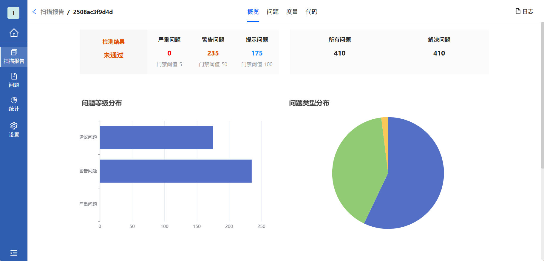 点击相应代码扫描编号,查看详细报告。代码扫描报告首页展示报告概览,通过扫描出的问题和设置的阈值展示代码扫描结果。