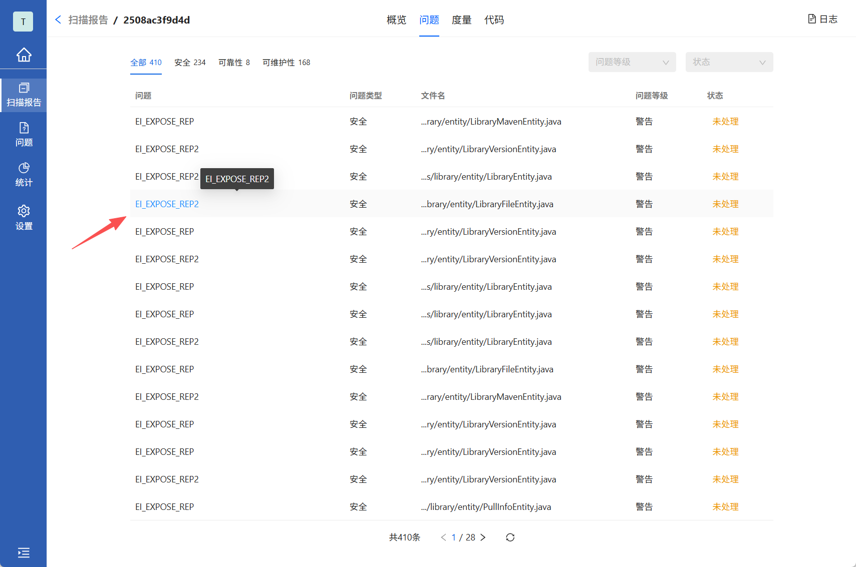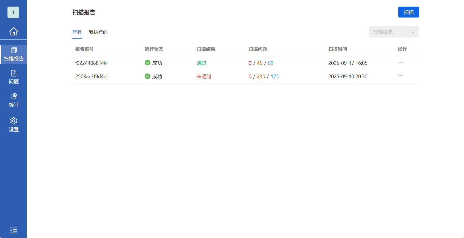点击问题TAB显示当次扫描历史出的所有问题列表。点击问题编号可查看详细问题描述。