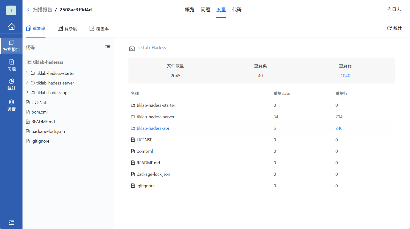在度量TAB可显示当前代码扫描历史的重复率、复杂度、覆盖率等报告。