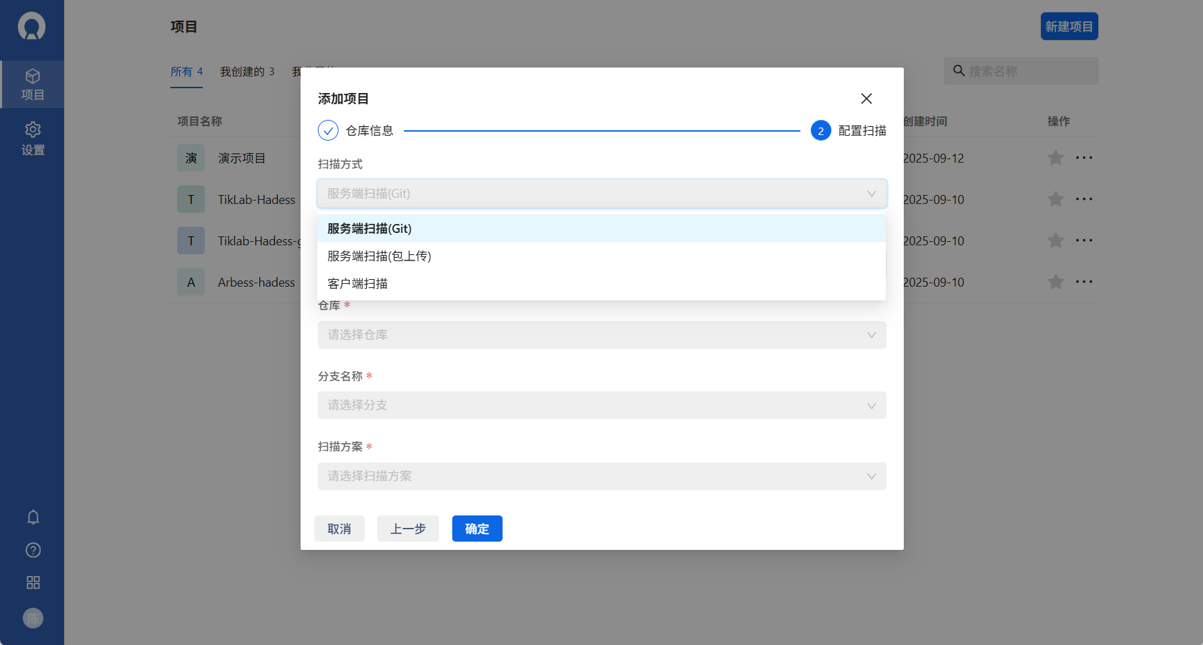 | 服务器扫描(Git) | 通过与GitPuk集成,通过Git的方式克隆源码进行代码扫描。 |