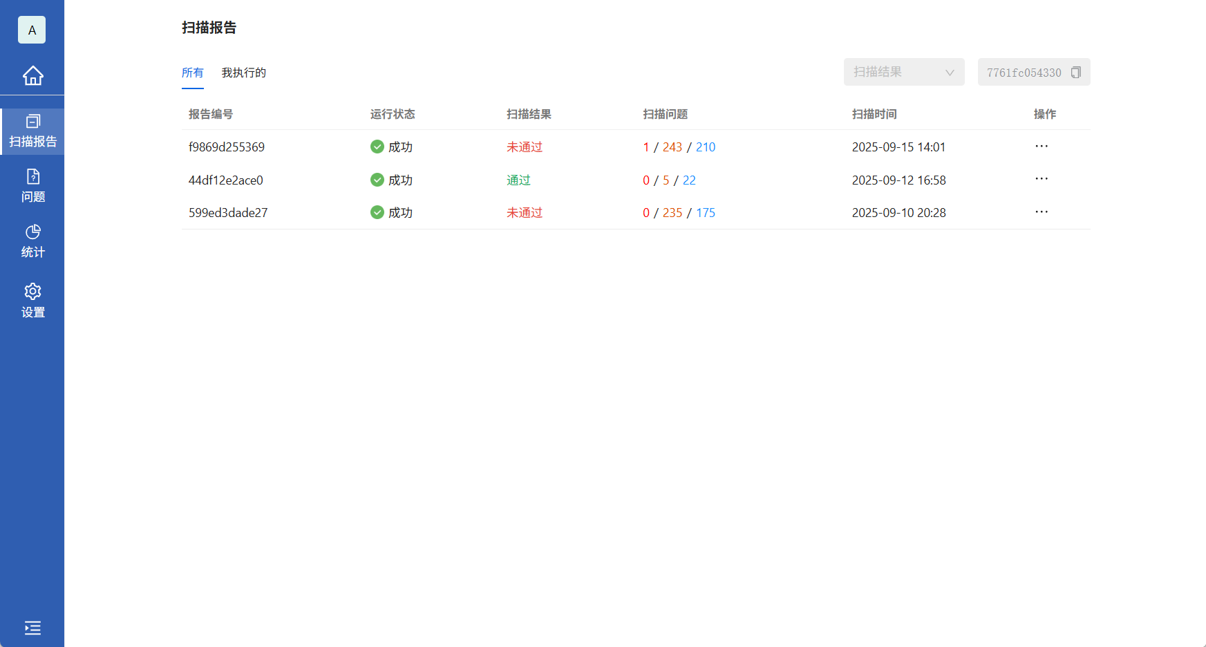 点击问题TAB显示当次扫描历史出的所有问题列表。点击问题编号可查看详细问题描述。