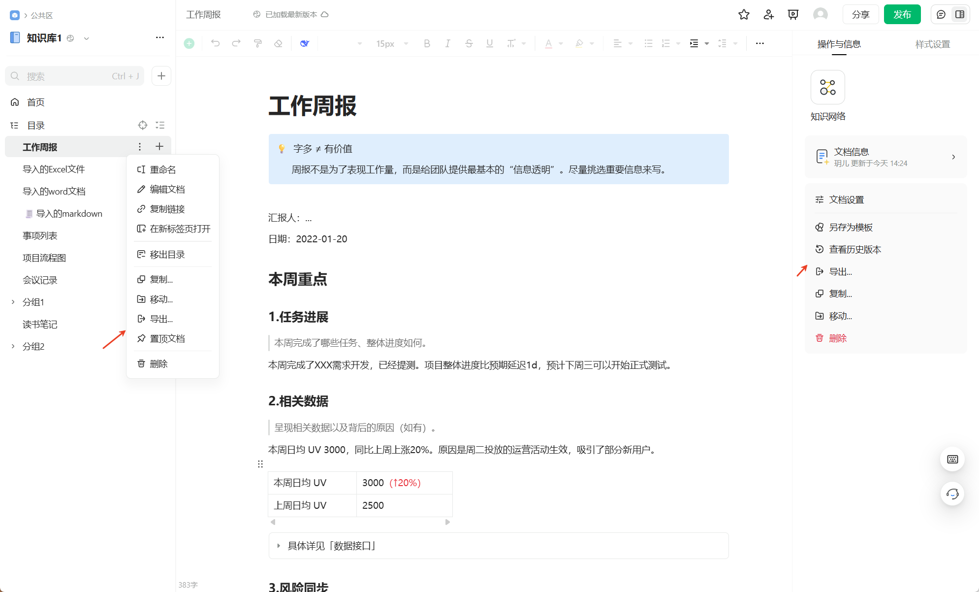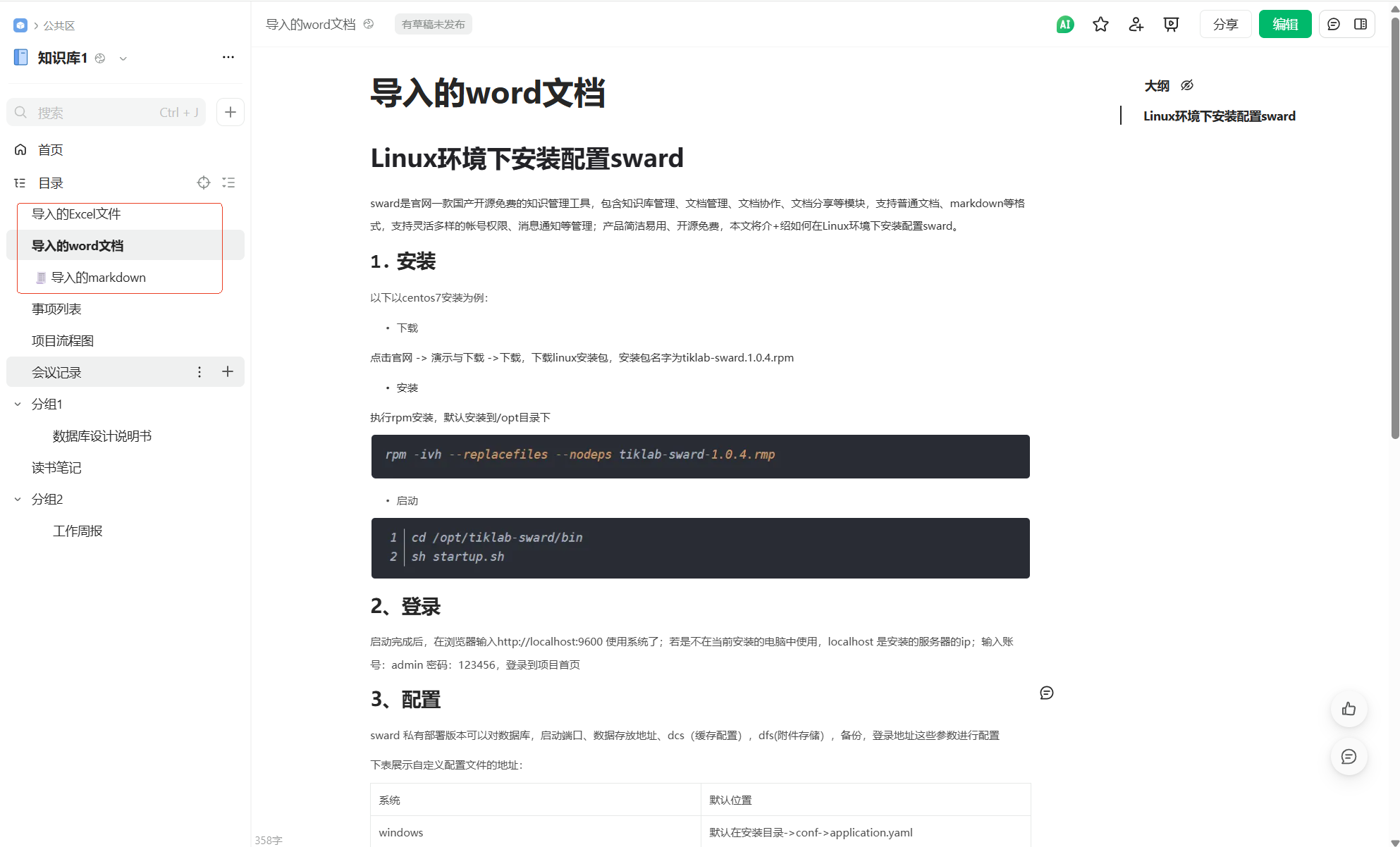 | 导入其他平台数据 | 从confluence或其他平台导出文件,并上传到语雀知识库中 | 只是导入文件的同时,支持将confluence空间导入变成sward的知识库 |