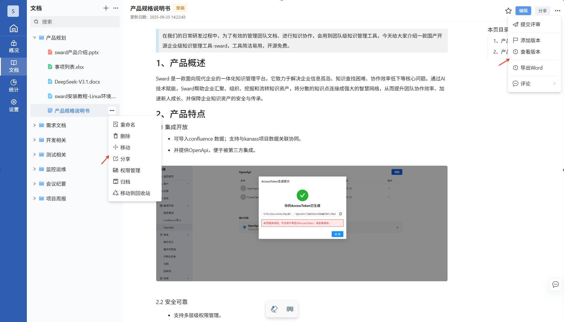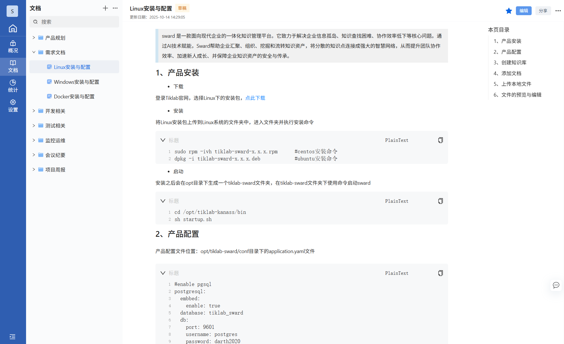 | 导入其他平台数据 | confluence、Evernote、Google Doc等 | 支持导入confluence空间,并变成sward的知识库 |