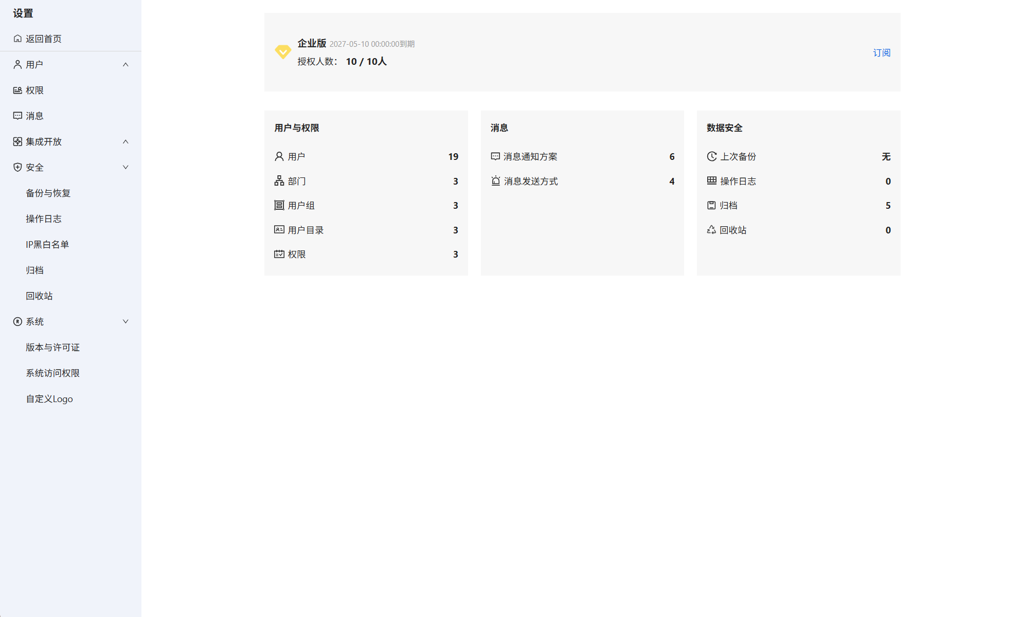 | 系统设置 | 用户与组织架构 | ✔ 支持添加成员,但没有组织架构 | ✔ |