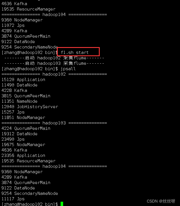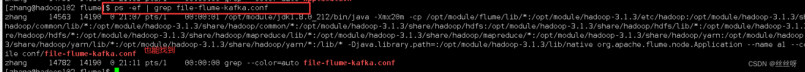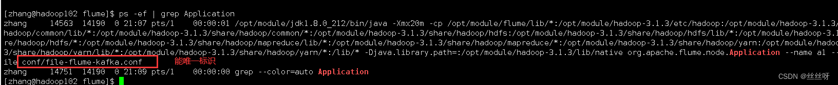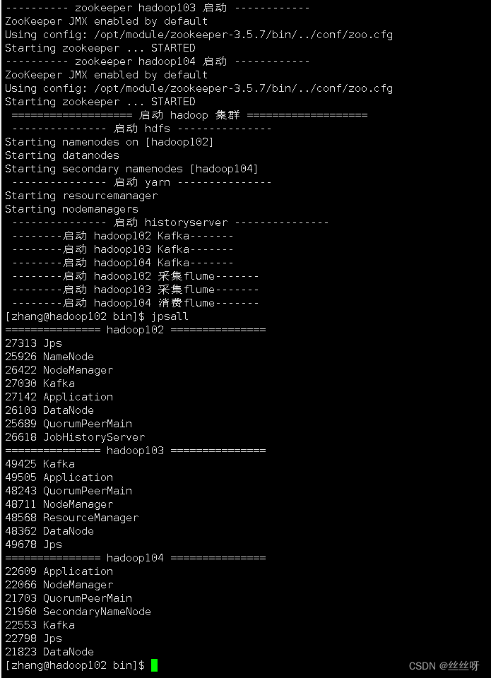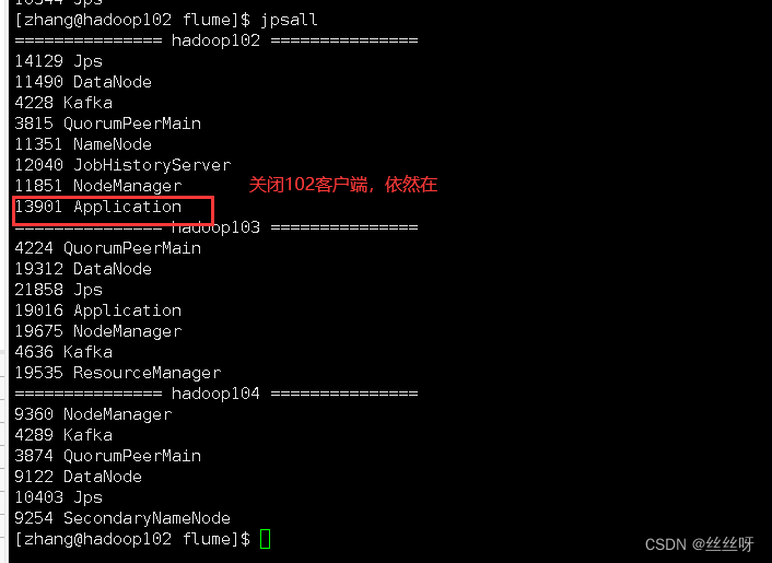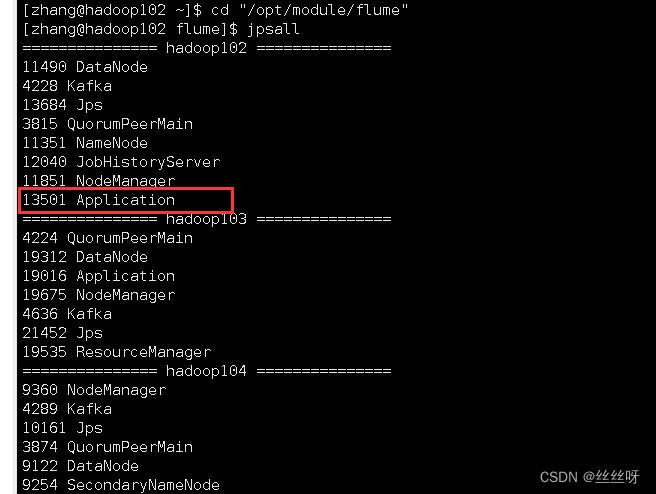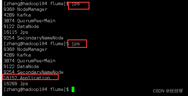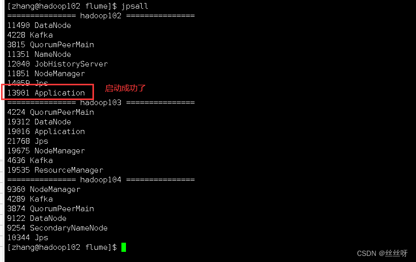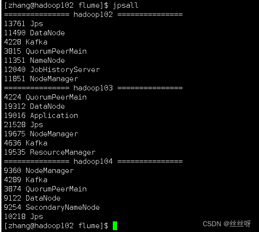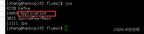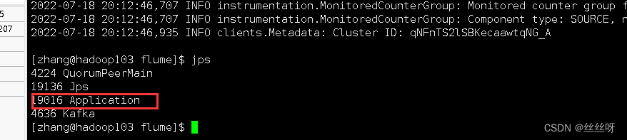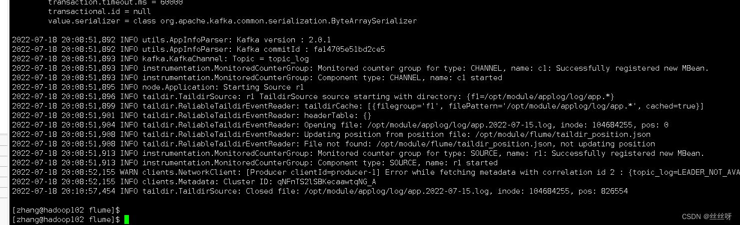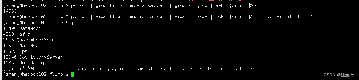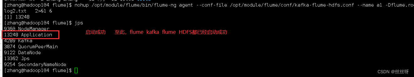 [zhang@hadoop104 flume]$ nohup /opt/module/flume/bin/flume-ng agent --conf-file /opt/module/flume/conf/kafka-flume-hdfs.conf --name a1 -Dflume.root.logger=INFO,LOGFILE >/opt/module/flume/log2.txt 2>&1 &