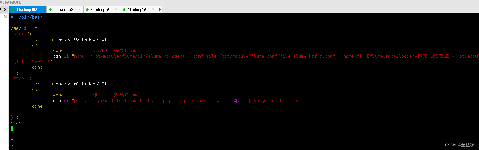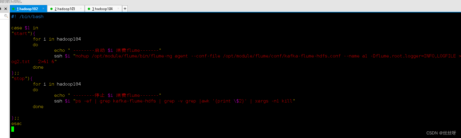 ssh $i "nohup /opt/module/flume/bin/flume-ng agent --conf-file /opt/module/flume/conf/kafka-flume-hdfs.conf --name a1 -Dflume.root.logger=INFO,LOGFILE >/opt/module/flume/log2.txt 2>&1 &"