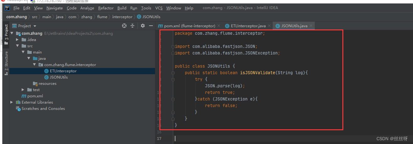 在com.zhang.flume.interceptor包下创建JSONUtils类