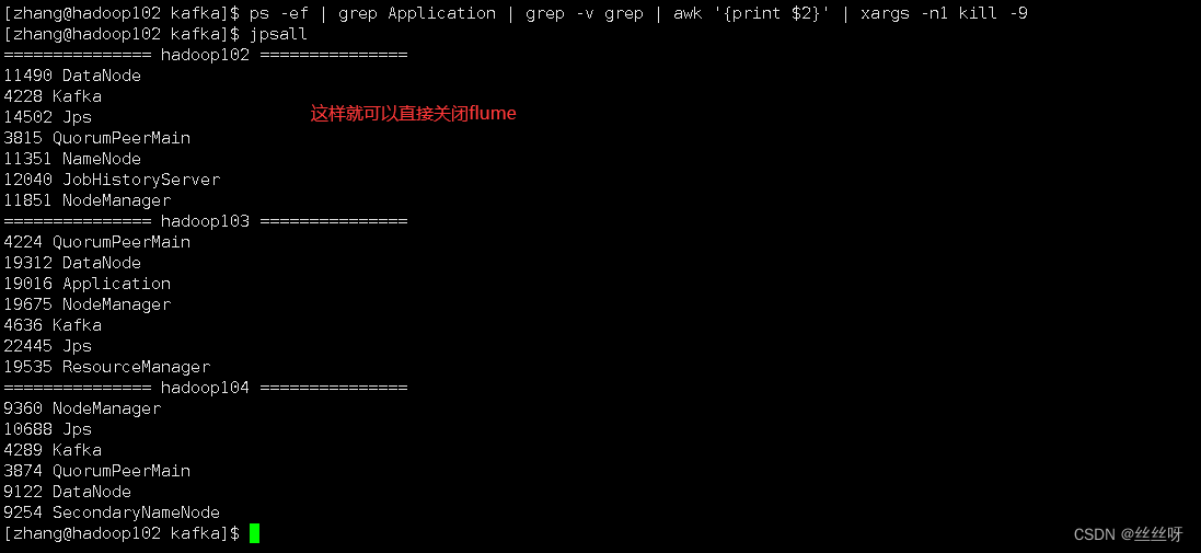 ssh $i "ps -ef | grep kafka-flume-hdfs | grep -v grep |awk '{print \$2}' | xargs -n1 kill"