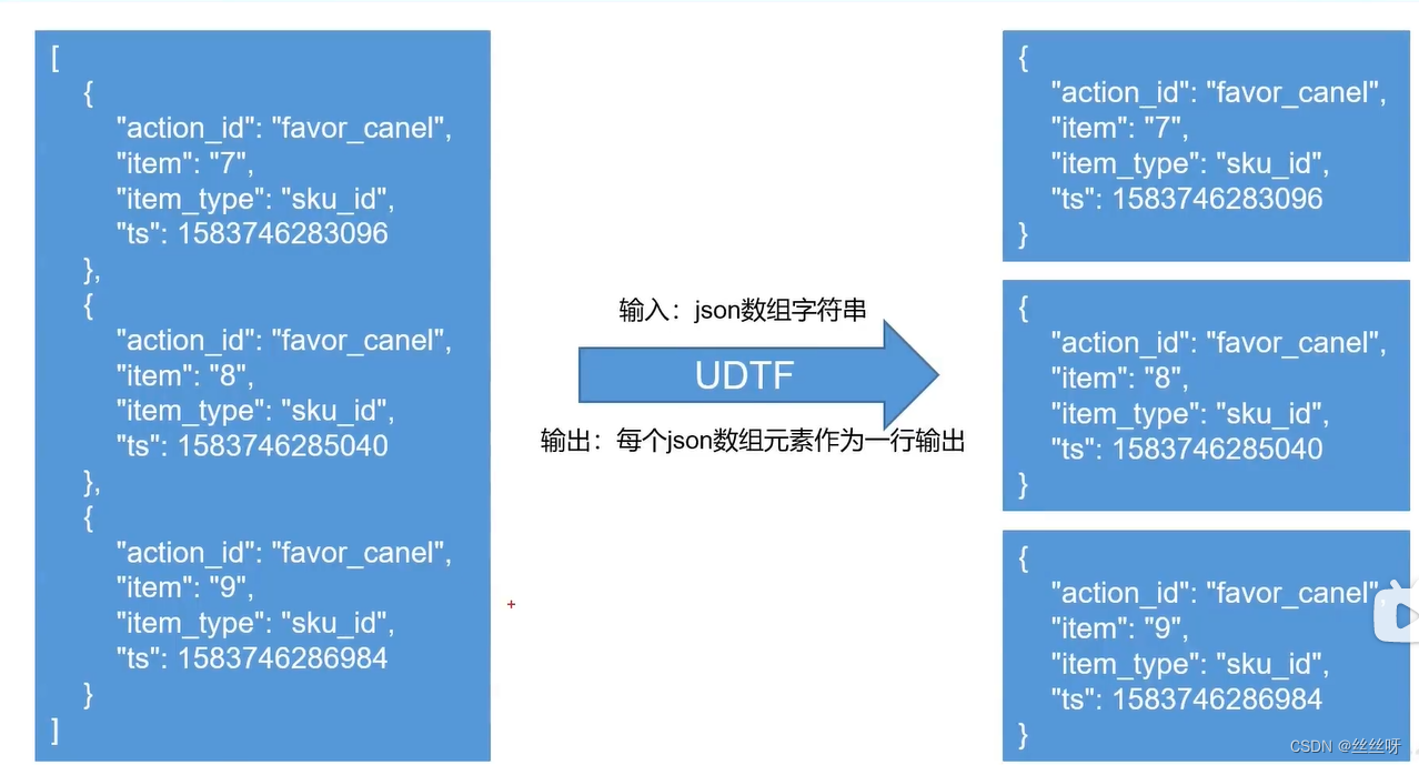 解析动作日志的时候,需要用到一进多出的操作(一条页面埋点日志有多个动作,而动作日志表中一行数据就是一个动作),也就是进来一条日志,要返回多条动作,hive中一进多出的函数:UDTF。