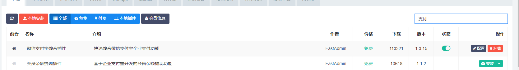 经常用fastadmin后台,这次的模板里面没有支付相关的代码,就想着用插件里的支付宝微信整合插件来试试看。
