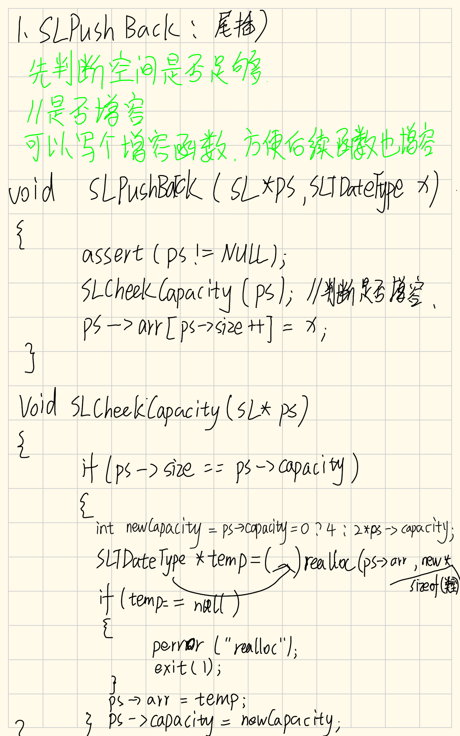 在写尾插操作过程中发现了其中的增容操作后续仍需要使用,所以,我们可以把增容这一部分给分离出来,单独设置一个函数,方便后续操作中的扩容操作