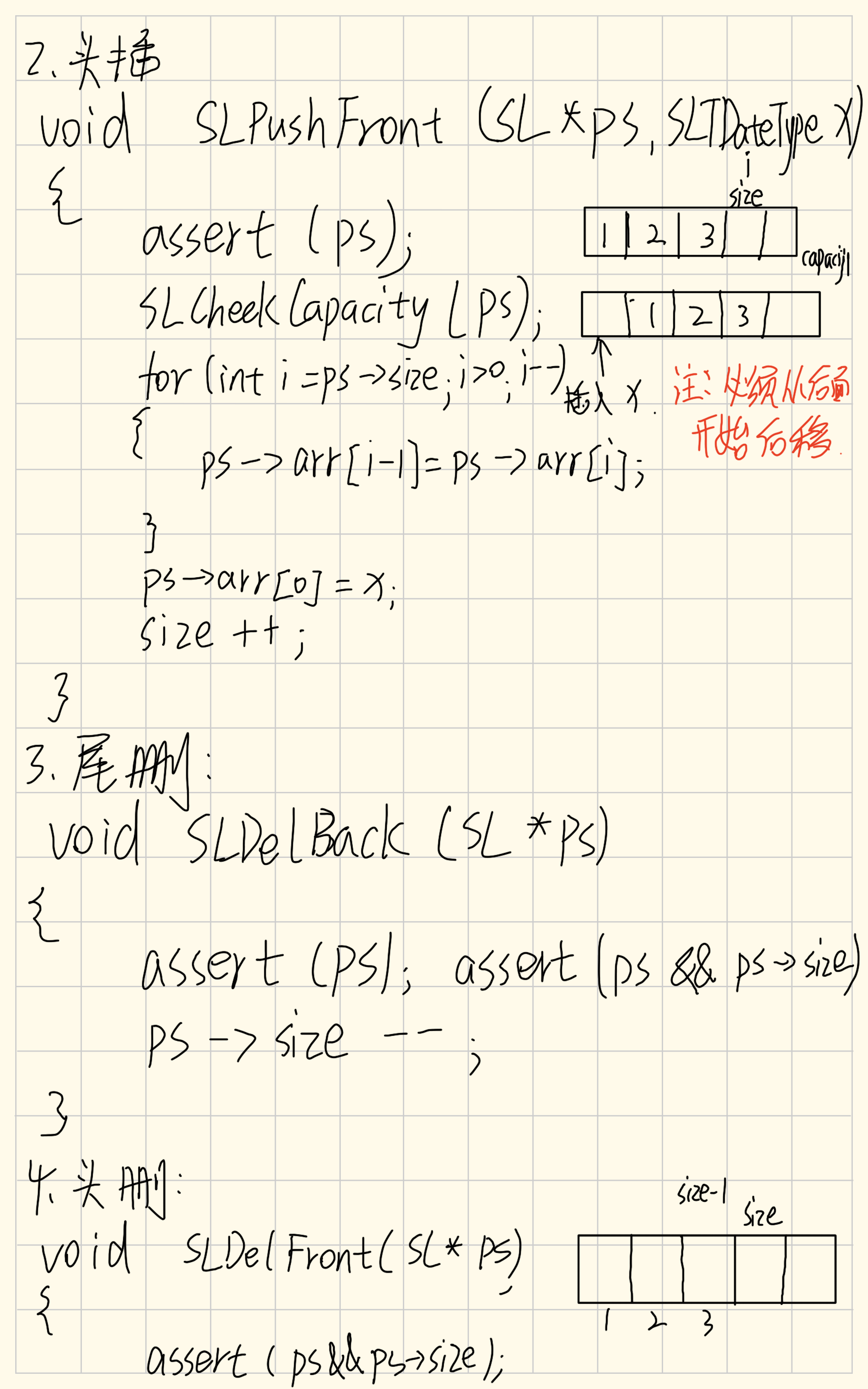 尾删就比较简单了,只需要将size前移一位,size后面的数据就不是有效数据了,相当于被删除。