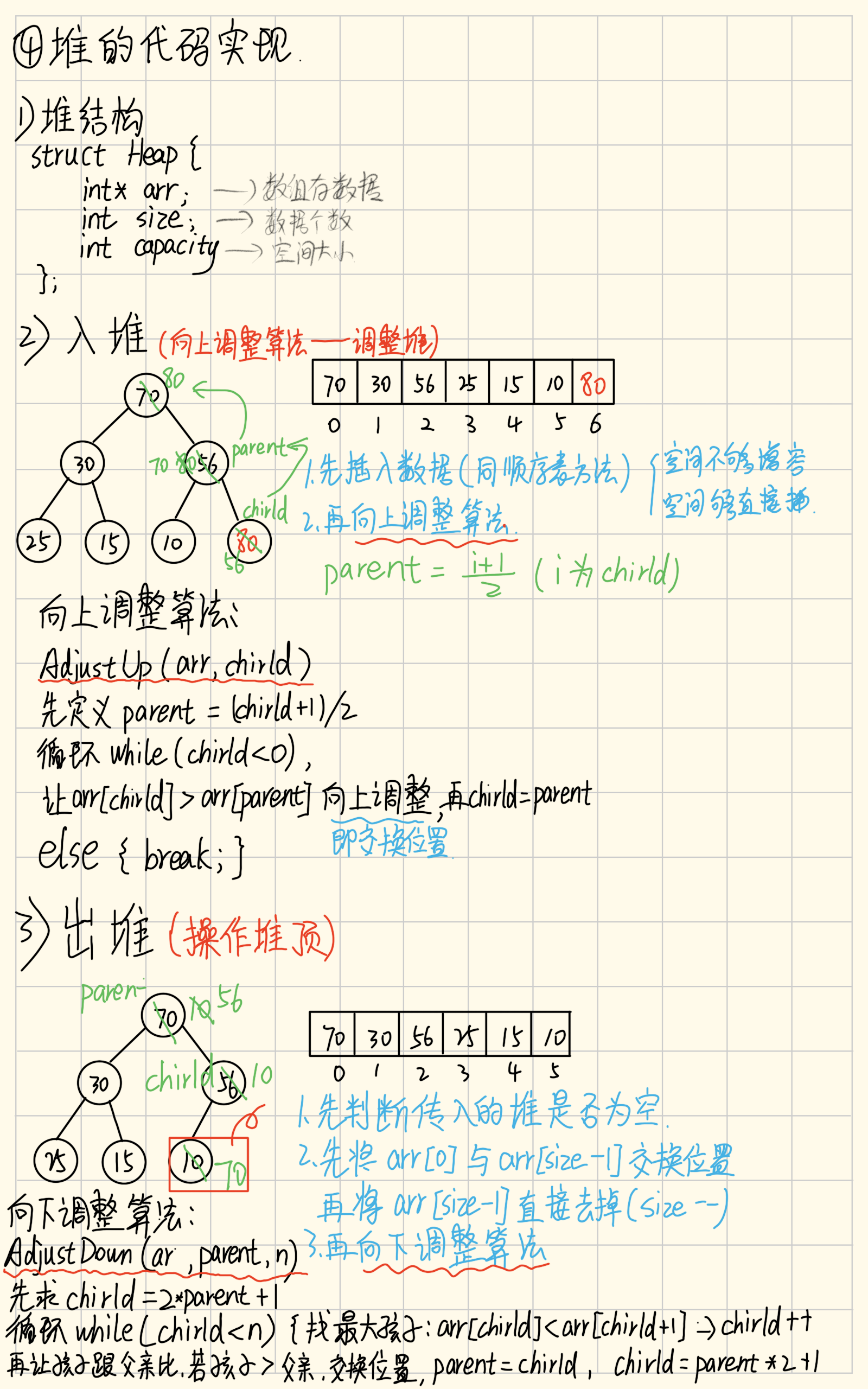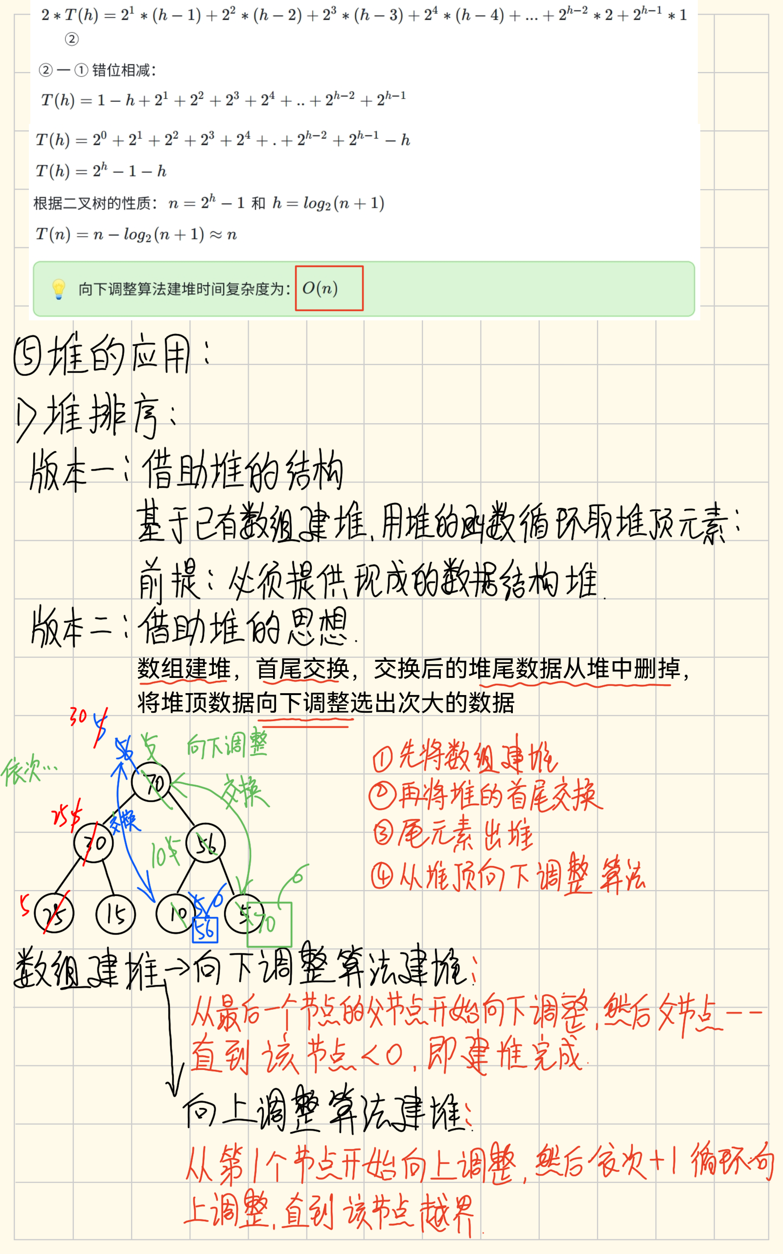 无需提供堆的结构和函数,直接使用数组建堆,建完堆后首尾相换,交换后将堆尾的数据删除,再从堆顶进行向下调整算法,如此循环到堆中的数据全部出堆。