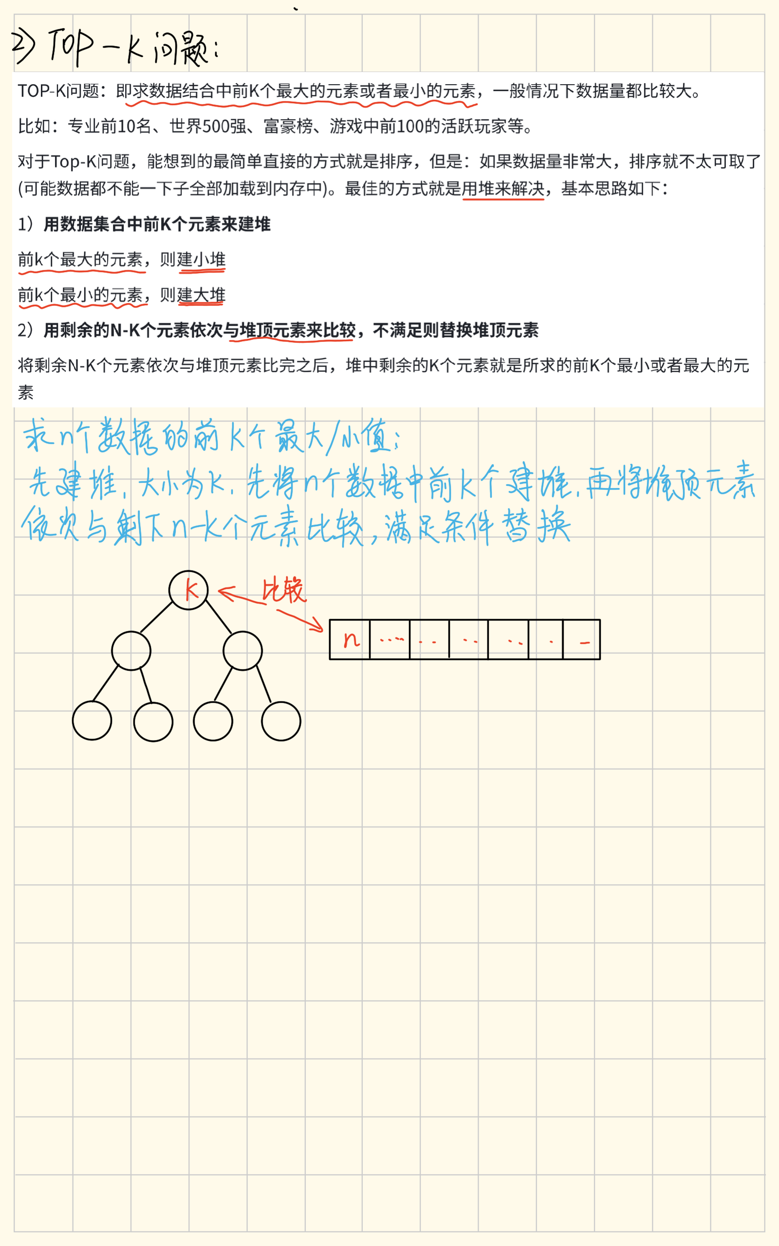 对于Top-K问题,能想到的最简单直接的方式就是排序,但是:如果数据量非常⼤,排序就不太可取了(可能数据都不能⼀下子全部加载到内存中)。最佳的方式就是用堆来解决,基本思路如下: